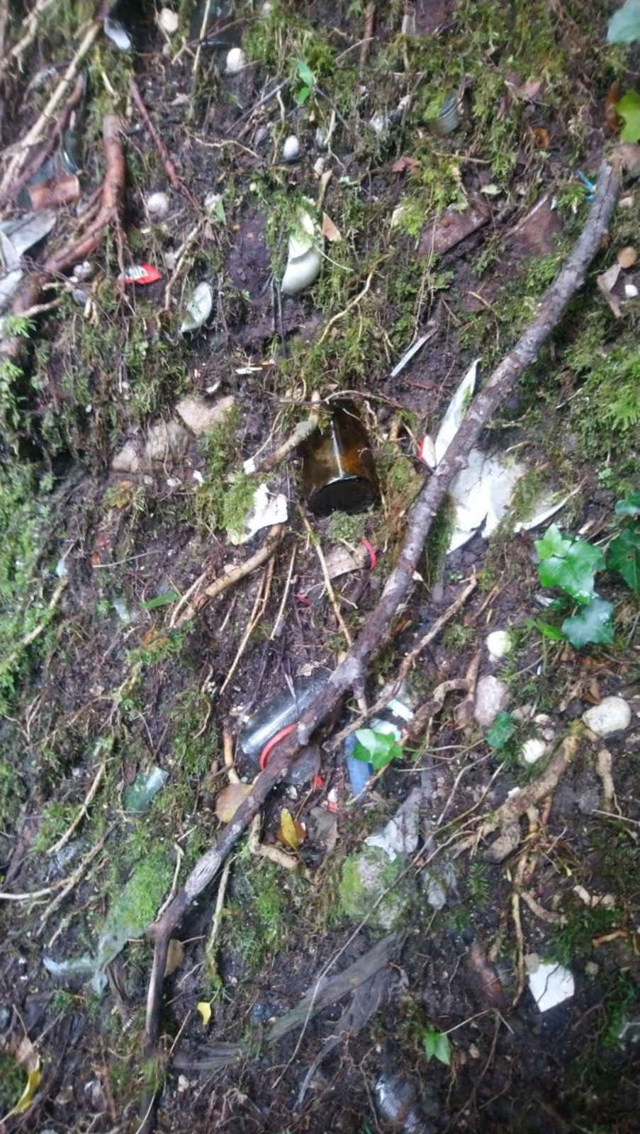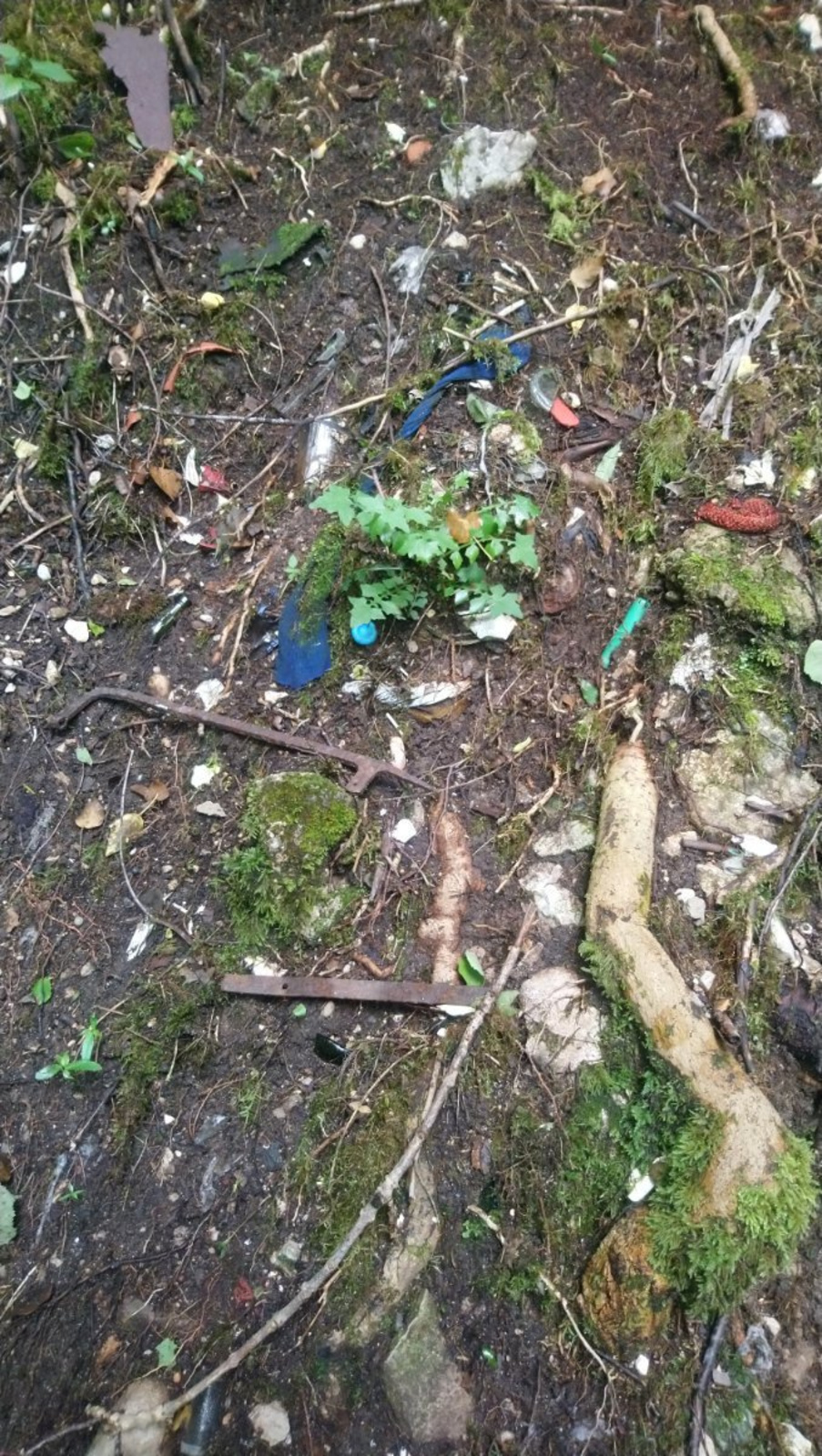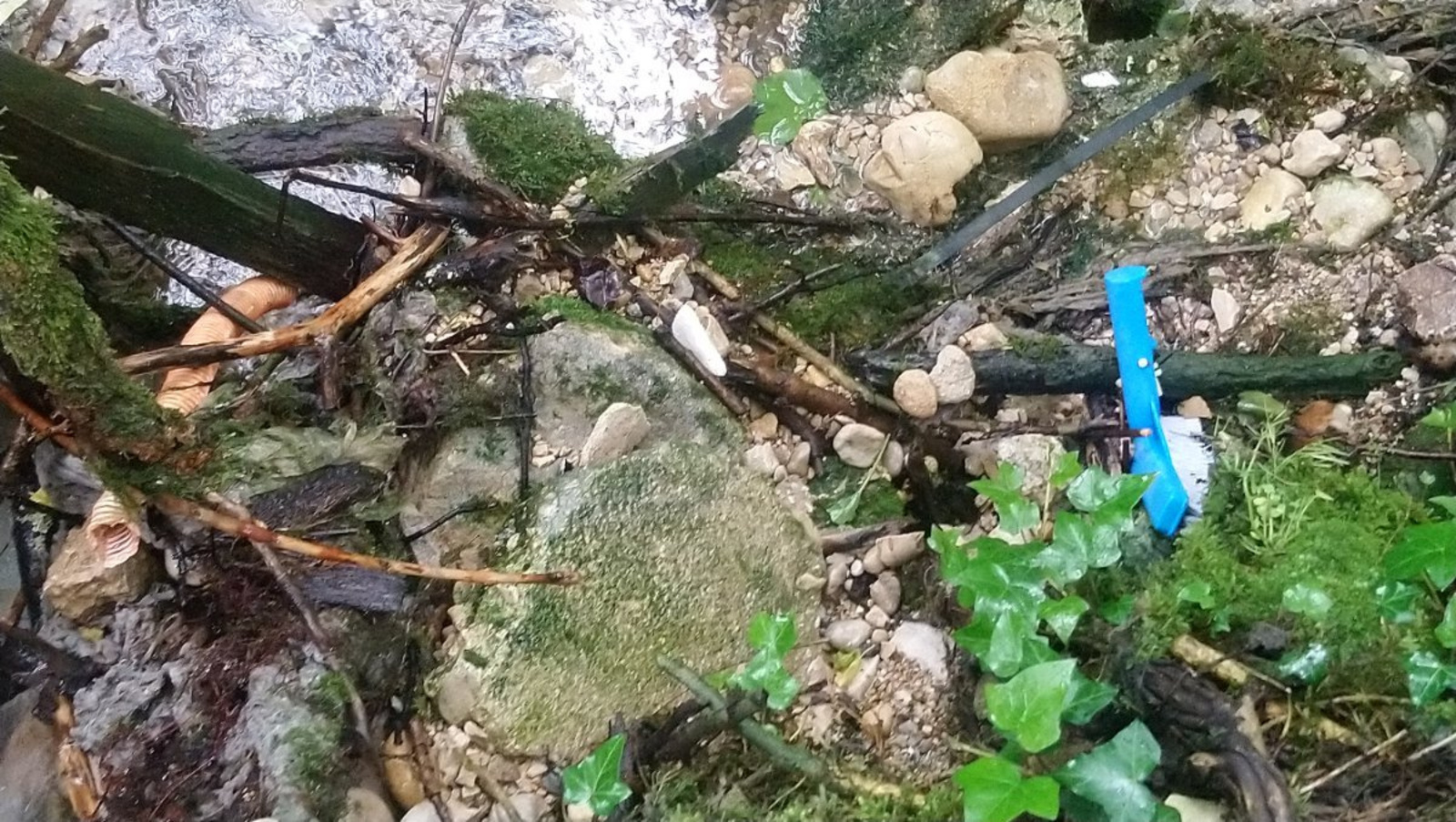Nombreux déchets de fer, bois, plastique, textiles déversés aux abords d'une rivière. Cela semble provenir d'une propriété privée à proximité