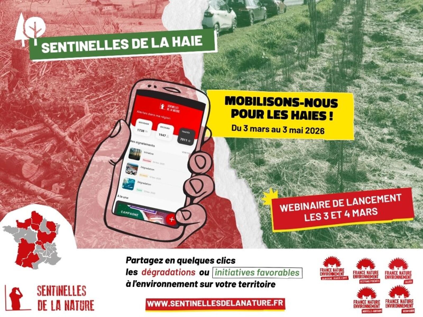 Ce printemps, durant la période de reproduction de nombreux animaux, le réseau associatif FNE dans plusieurs régions vous invite à l'action pour la préservation des haies. Durant la campagne « Sentinelles de la Haie », du 3 mars au 3 mai 2026, toute personne peut participer en nous informant des initiatives favorables aux haies et des éventuelles atteintes.