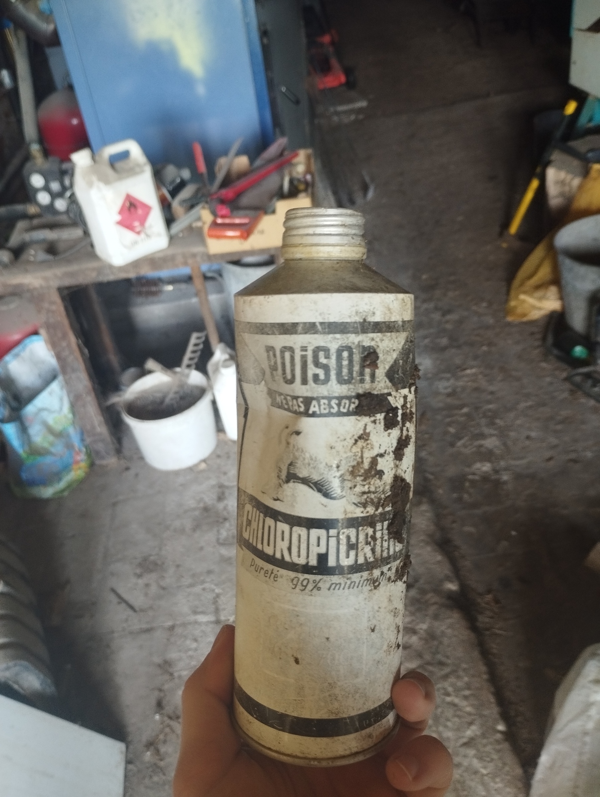 Flacon de chloropicrine découvert à proximité d'un terrier de blaireau. Du produit est encore présent à l'intérieur.