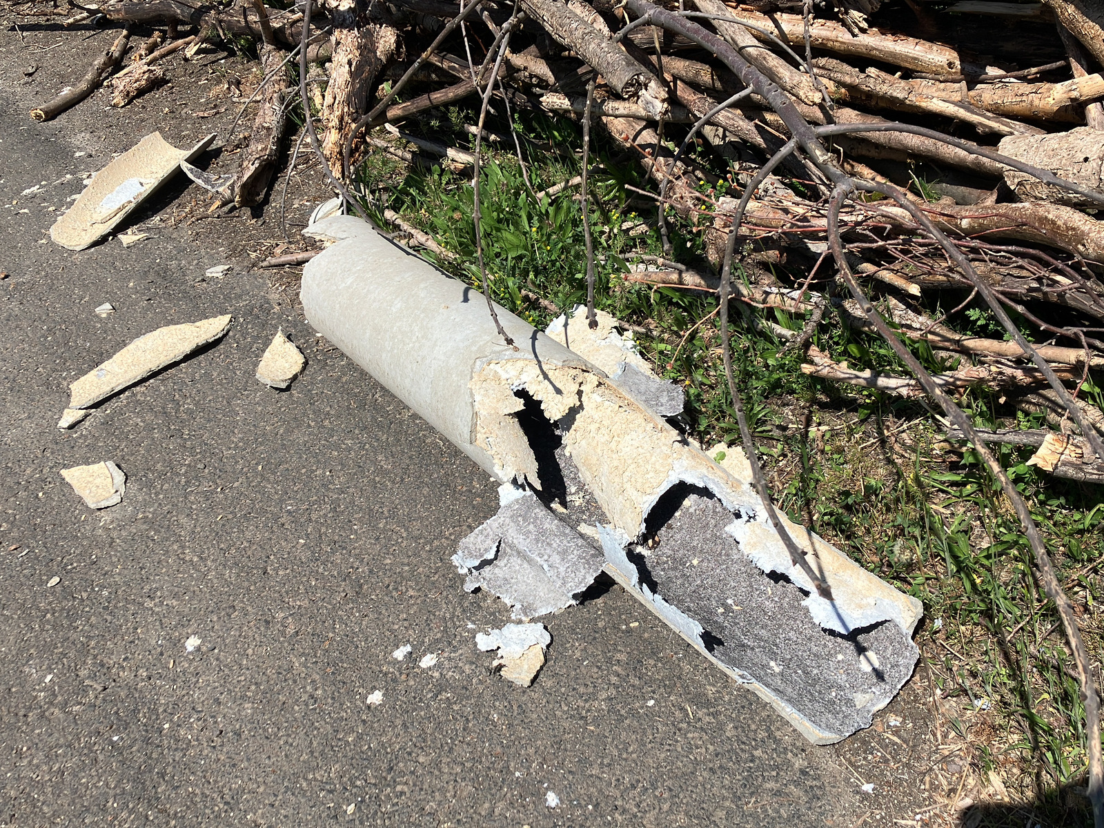 Déchets de construction en fibrociment déposés en bord de chemin carrossable.